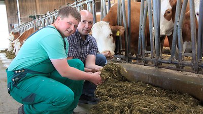 Außerdem hat Eike Holfeld beobachtet, dass die Kühe ihr Körpergewicht nach dem Abkalben besser halten können. Offenbar wird das Körperfett nicht mehr so stark abgebaut wie früher. Auch hier liegt die Erklärung darin, dass das energielose Stroh jetzt durch 350 g mehr Gras und 650 g SHREDLAGE® ersetzt wird, und dass den Kühen damit mehr energiereiches Grundfutter zur Verfügung steht. Auch die Kälber, die bis zum Alter von sechs Monaten die gleiche Mischung wie die Kühe bekommen, nehmen das neue Futter sehr gut auf und entwickeln sich stabiler als früher.